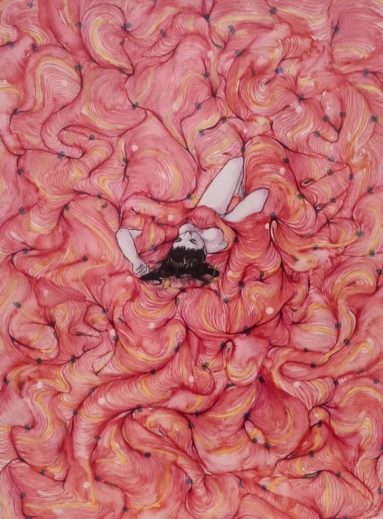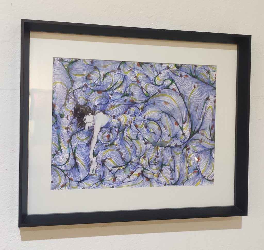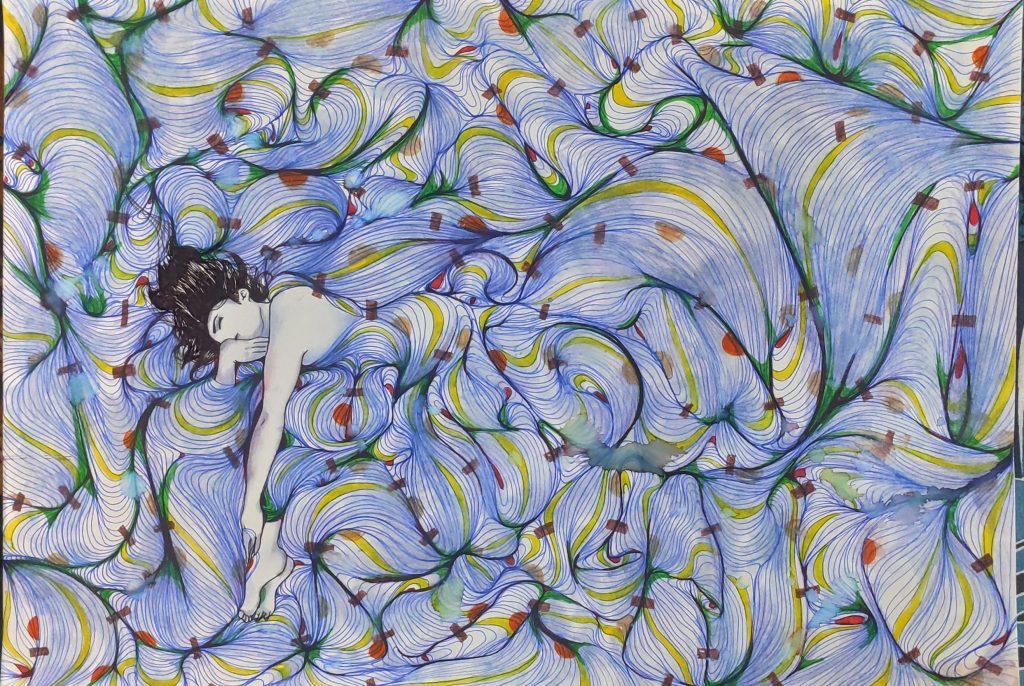“Contrairement à ce qu’on le croit, les nuits de l’artiste ne sont pas complètement silencieuses : elles sont aussi un songe d’un autre monde, où le silence peut surprendre telle une entité abstraite, enveloppant son corps de ses bruits inaudibles. Les dessins sont réalisés comme des phases de méditation, au coin de la chambre de l’artiste. Ils sont des représentations du monde des silences et des vibrations, dont le personnage est l’artiste elle-même, mise à nue et qui fait-corps avec les vagues abstraites. Ils sont deux opposés, entre amour et rejet du monde de silence, qui est lié à sa surdité. Un monde dont elle ne peut pas s’échapper, qui l’enveloppe comme les rêves et les cauchemars d’une nuit, à l’image d’un drap dont elle ne peut pas s’en passer pour bien dormir. Un monde qu’elle aime et qu’elle haït, puisque selon elle, le silence du repos fait jaillir des entités insoupçonnées de sa perception sonore. Les couleurs sont inspirées du protocole « le spectre des sourds », qu’elle a développé au cœur de sa démarche artistique, afin de représenter les vibrations perçues des silences.”