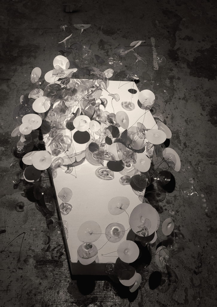 “Et si le silence telle que l’artiste connaît, disparaissait complètement de La Réunion ? Quels genres de parasites sonores renaîtront ? La sculpture poursuit la réflexion de l’installation sonore « en mémoire des silences (2021) » : durant son voyage sur l’île, l’artiste remarque une disparition lente du silence. Elle alarme sur la présence de plus en plus fréquente des bruits parasites sous formes de vibrations, très souvent de source humaine. Ceux-ci lui provoquent des sensations désagréables ou des douleurs. Ils encouragent également la fuite de la faune et de la flore. Rarement entendus et pourtant perceptibles, ils sont transformés en « fleurs sonores ». Leur transparence rappelle l’invisible. Ces fleurs sont inspirées des Arums de La Réunion, belles à voir mais qui sont de véritables parasites pour certaines forêts, la faune et la flore. La tombe représente une version pessimiste de la disparition du monde silencieux qu’elle chérit, envahie par les fleurs appréciées par ceux ou celles qui craignent le silence. A force de rechercher le monde du silence qu’elle connaît, elle a le sentiment de rechercher un être qui n’existe plus aujourd’hui.”