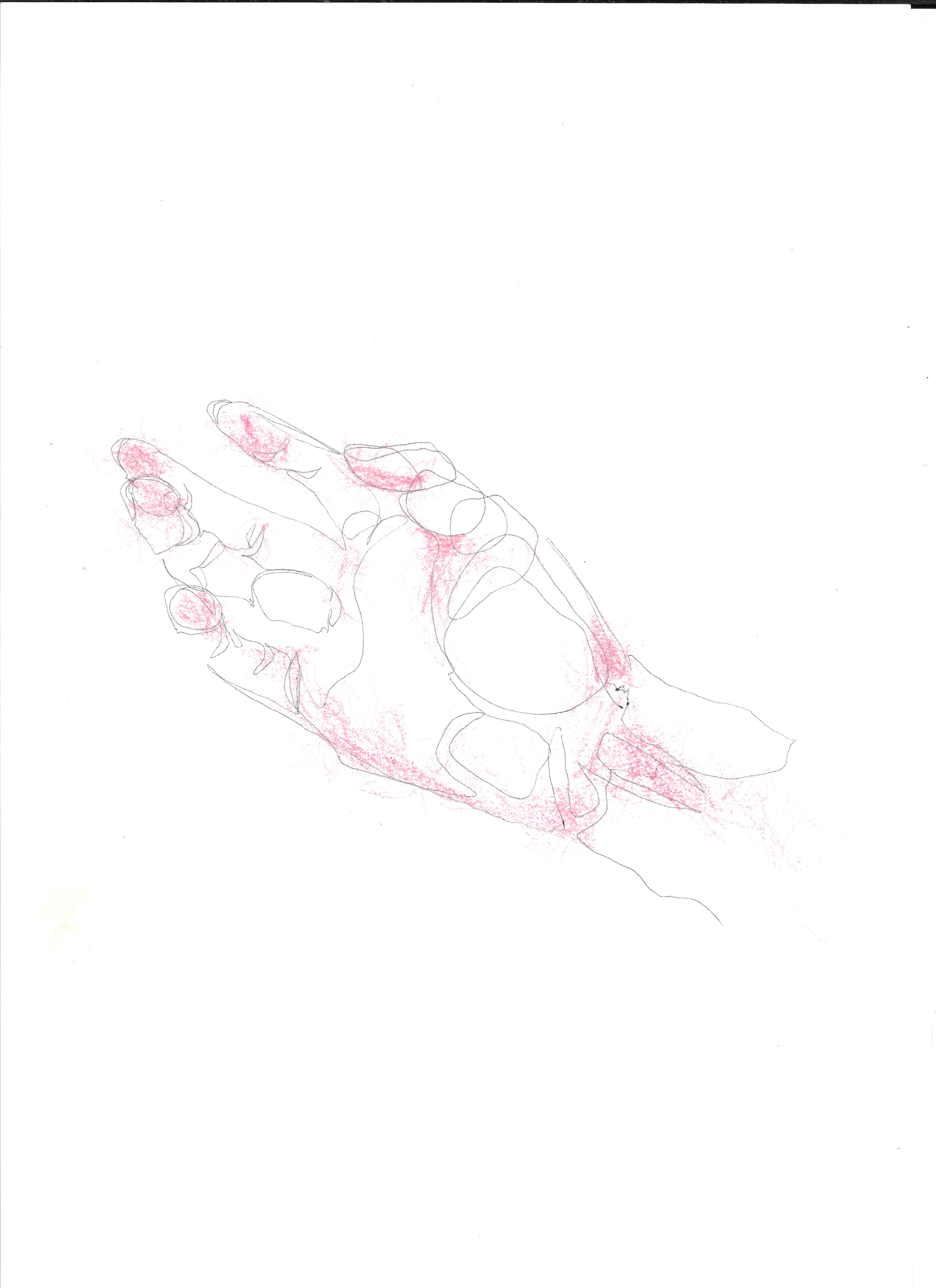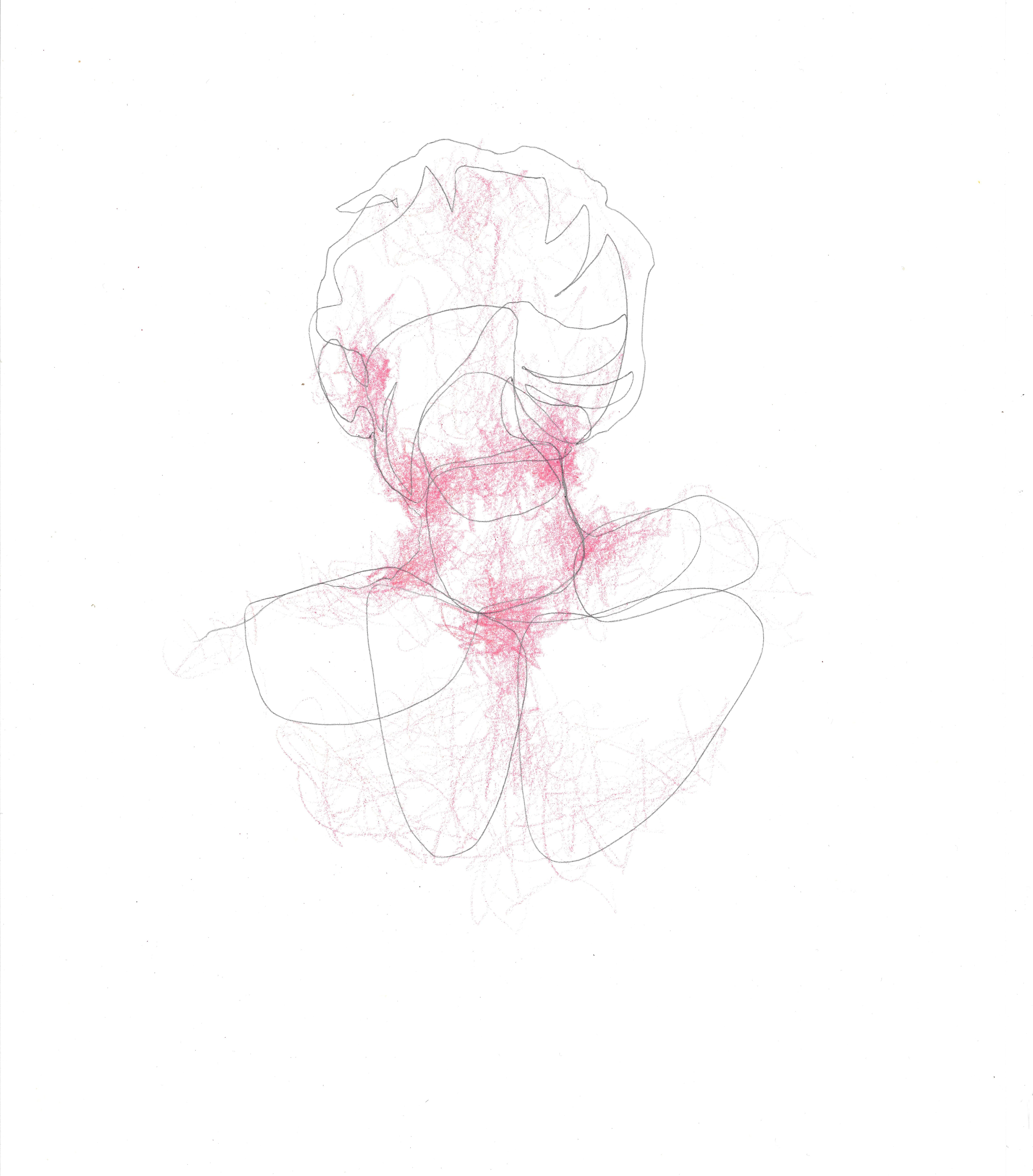 I develop an opportunity to present a silent world as a narrative in the form of images. Several drawings will compose their own series, since they repeat the same theme each time: listening to the sounds that I hear through my body every day, since I am deaf from birth. Absolute silence does not exist, as the composer John Cage once strongly supported. All these drawings hold a story with its sad facets: they were all made during The first confinement during the health crisis 2020 around the covid-19, i.e. from March 2020 to April 2020. Containment amplified silence. My body already lived in a noisy silence daily, but the silence of confinement, instead of being totally therapeuthic, doubled the chaotic cacophony of the body's sounds. The confinement has exposed the body, making it invisible, almost invisible because of the presence of many vibrations. The black lines delineate the parts of my body that I barely see. The blood circulation swells, the heart is a drum that the neighborhood could hear from their own ears, the joints of the body grin, crack, the muscles glar with each movement. Red is a color, which through a protocol that I had developed, represents the serious sounds but which seem to "talk" in arduous or passionate way. The drawings became a testimony of a silence perceived by the body, which became violent and mild to the faith